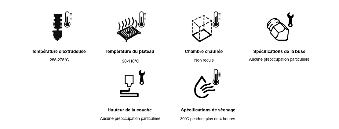 • Propriétés thermiques supérieures par rapport aux PLA, PETG, ABS et ASA